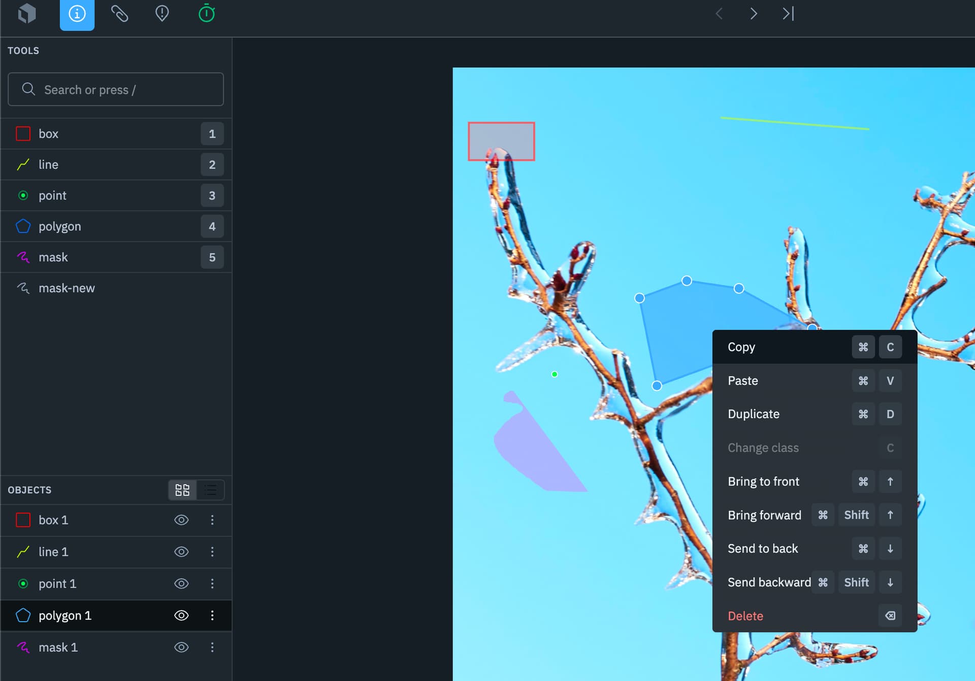 I am labeling images in a time sequence, so I want to be able to copy the objects (freestyle, polygon, etc.) onto the next image since they do not change much from image to image. When I try to copy each object (either ctrl + c or right clicking to see copy option) this option is greyed out and ctrl+c does not work. Anyone else have this problem?